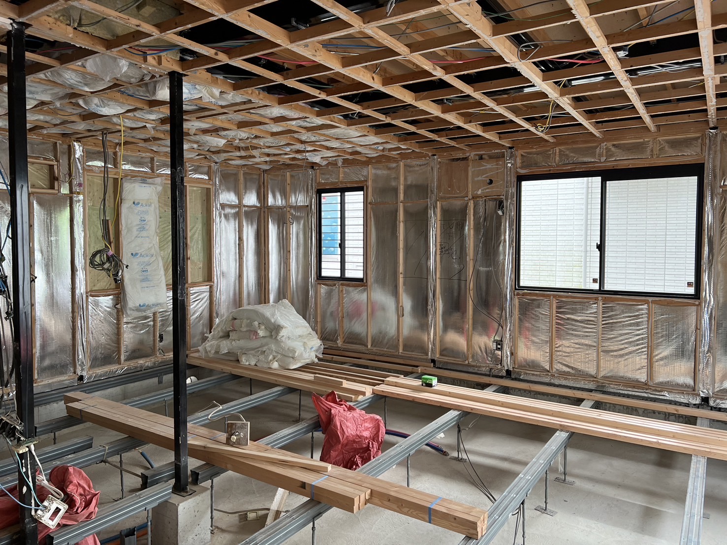 熱源が床の下にあり、熱が床を伝わり部屋の内部に広がって部屋全体をまんべんなく温めてくれます。またキッチンの場所を変更するのに伴い窓を外し、壁を作る工事もしていきます。