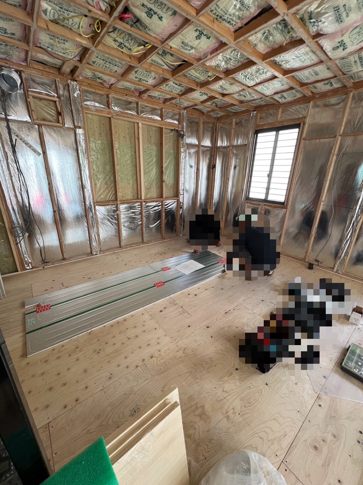 既存の床を全て外し、床暖房のパネルをひいていきます。